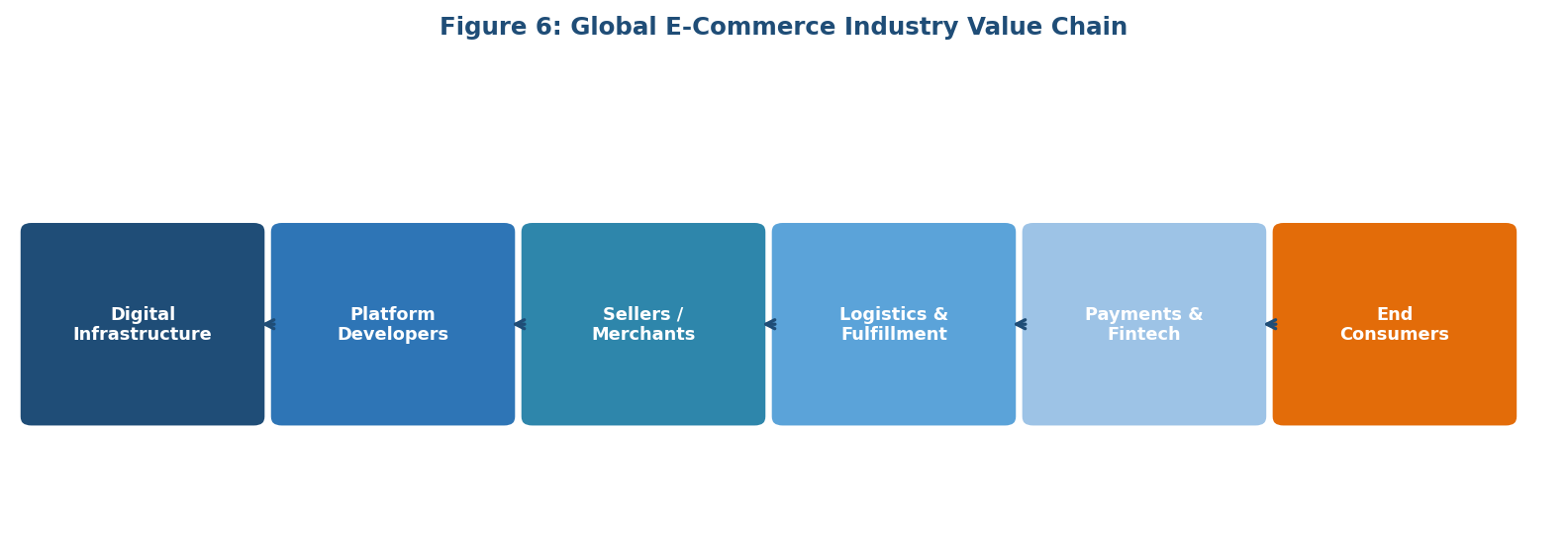 The e-commerce value chain spans six integrated stages from digital infrastructure provision through end-consumer delivery. Each stage presents distinct competitive dynamics, investment requirements, and margin profiles.