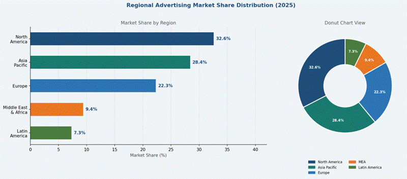 - North America's 32.6% share reflects the concentration of major global digital advertising platforms (Google, Meta, Amazon), the world's largest advertising holding companies (WPP, Omnicom, Publicis, IPG), and the highest-per-capita advertising investment among all major geographies.