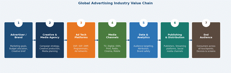 The advertising industry value chain encompasses seven interconnected stages from brand strategy development through to audience delivery and campaign measurement. Each stage involves specialized expertise and technology infrastructure that collectively determines advertising campaign effectiveness and return on investment.