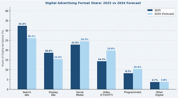 Video advertising's share is expected to significantly increase within digital formats (2025–2034) reflects the structural migration from linear television to streaming video, the monetization of short-form video platforms (TikTok, YouTube Shorts, Instagram Reels), and the rapid adoption of CTV advertising by both direct-response and brand advertisers.