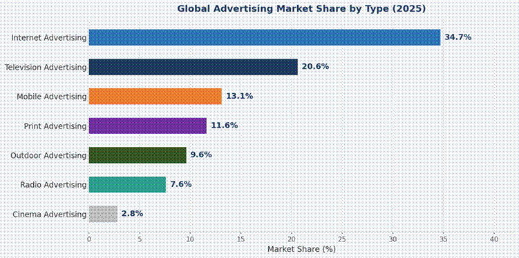 - Internet advertising’s 34.7% share (2025) reflects the dominance of search, social media, display, and programmatic video formats as the primary media investment destination for performance-driven advertisers globally.
