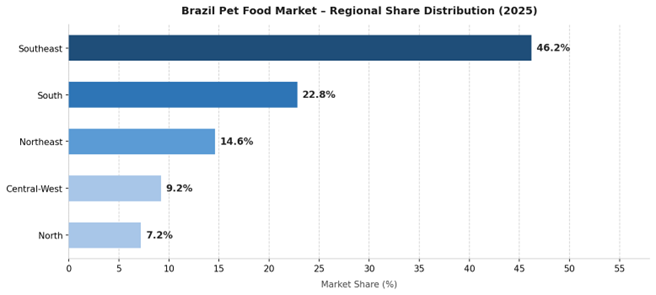 Brazil's vast geographic and economic diversity creates distinct regional pet food market dynamics. The Southeast leads with 46.2% of the national market in 2025, while the South holds 22.8%, the Northeast 14.6%, Central-West 9.2%, and the North 7.2%.