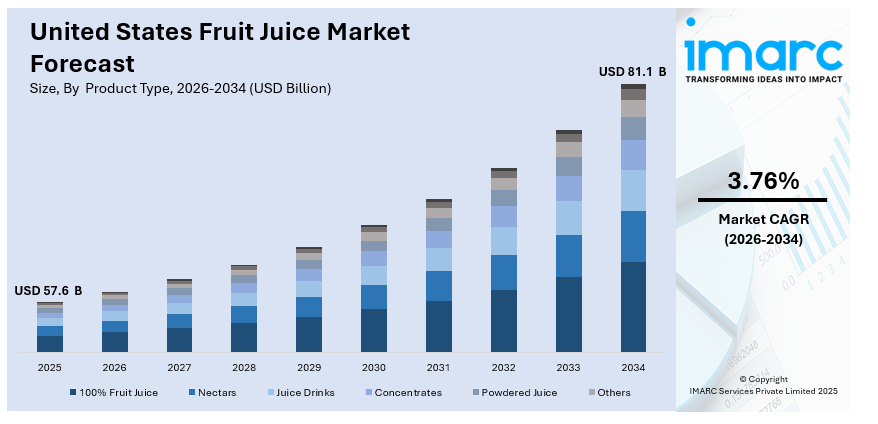 The United States fruit juice market size was valued at USD 57.6 Billion in 2025. Looking forward, IMARC Group estimates the market to reach USD 81.1 Billion by 2034, exhibiting a CAGR of 3.76% from 2026-2034. The market is driven by the growing health consciousness, increasing demand for natural and organic beverages, and the popularity of convenient, ready-to-drink (RTD) options. Innovations in flavor combinations and fortified juices are attracting diverse consumer segments. Additionally, the rising interest in sustainable packaging and locally sourced ingredients are bolstering the United States fruit juice market share.