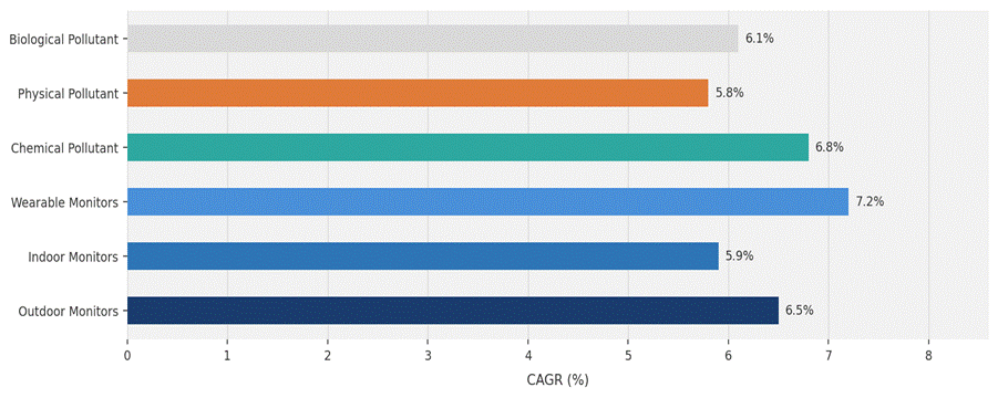 Wearable monitors lead segment growth at an estimated 7.2% CAGR, while Chemical Pollutant monitoring grows at 6.8, reflecting personal health monitoring trends and chemical emission compliance needs.