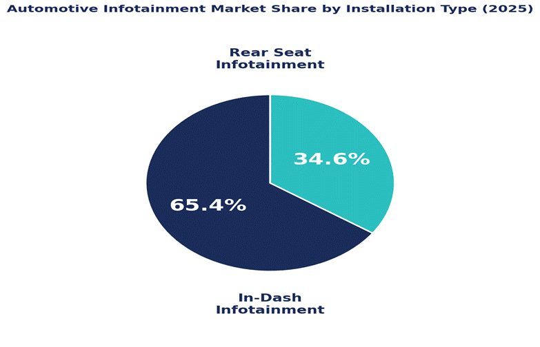 In-Dash Infotainment leads with a 65.4% share in 2025, driven by OEM-standard large-format touchscreen adoption and integrated cockpit domain controller architectures across mainstream and premium vehicle segments.