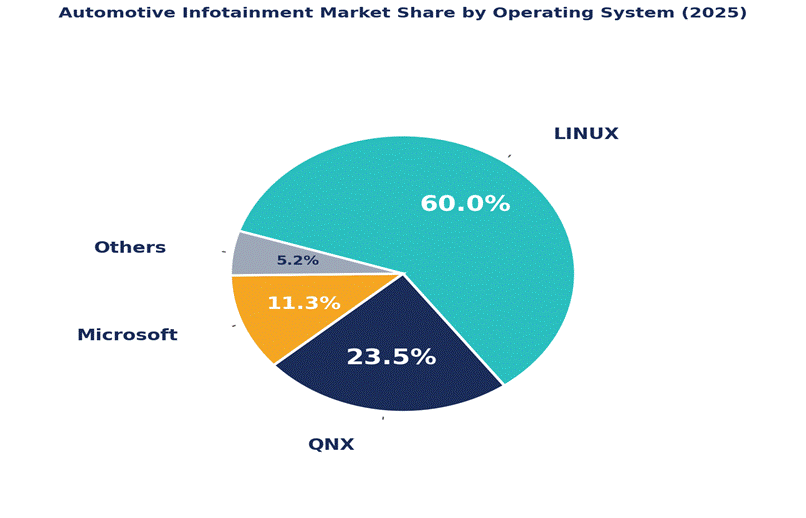 QNX at 23.5% in 2025, maintaining a strong position in safety-critical and premium ADAS-integrated applications due to its ASIL-D ISO 26262 certification and real-time processing capabilities. Microsoft at 11.3% primarily serves European infotainment integrators and commercial vehicle applications where Windows-based fleet management integration is preferred. Others (5.2%) encompass Android Automotive deployments in volume Asian markets and fully proprietary OS implementations by Tesla and Chinese OEMs.
