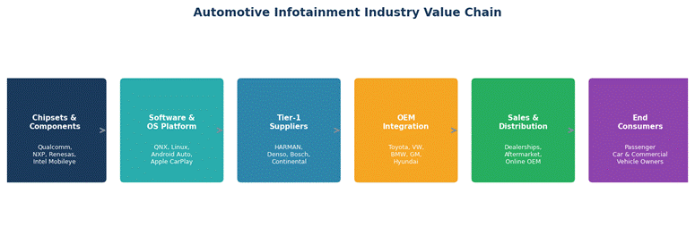 The automotive infotainment value chain spans six integrated stages from semiconductor component supply through end-consumer vehicle delivery. Each stage presents distinct competitive dynamics, margin profiles, and technology investment requirements.