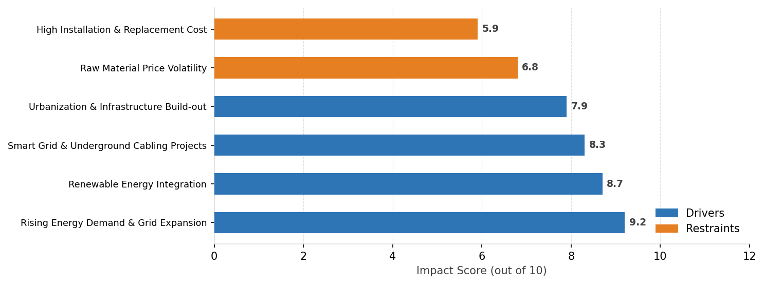 Key drivers include rising energy demand, renewable energy integration, urbanization, smart grid deployments, and growing underground cabling projects globally.