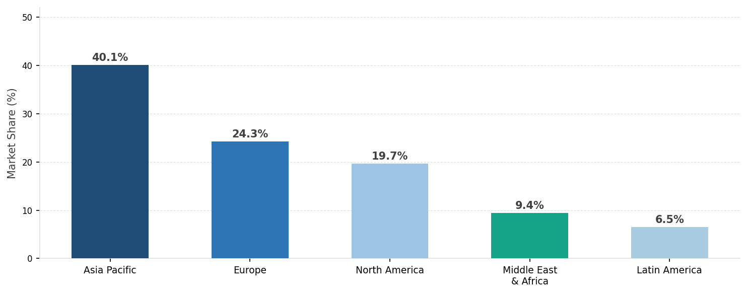 - Asia Pacific commands 40.1% of global revenues (2025), supported by the Asian Development Bank (ADB), which estimates that Asia will need to invest around USD 1.7 trillion annually in infrastructure through 2030 to sustain economic growth, reduce poverty, and address climate risks.