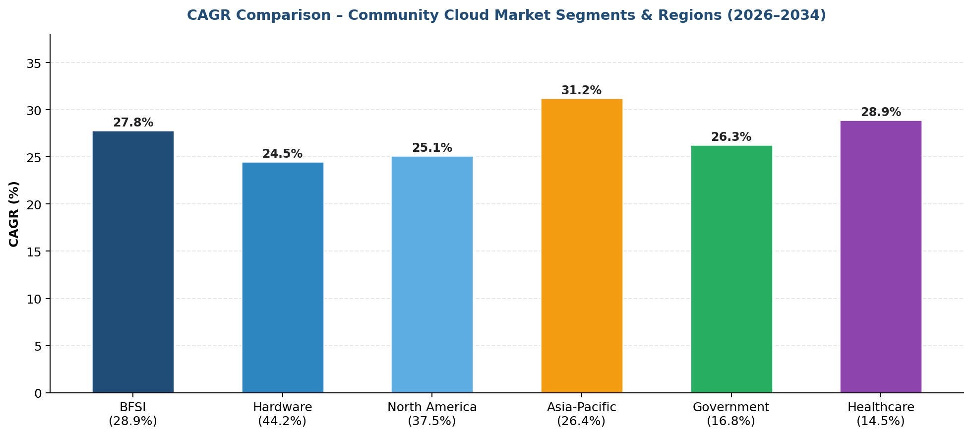 Segment-level CAGR comparisons highlighting Asia-Pacific and BFSI as the two fastest-growing categories within the global community cloud industry analysis through 2034.