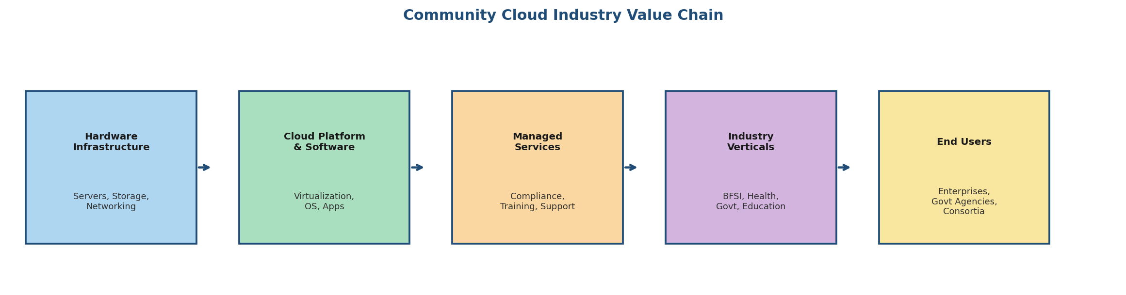 The community cloud value chain spans five integrated stages from physical infrastructure supply through end-user service delivery. Each stage presents distinct competitive dynamics and technology investment requirements unique to the shared, sector-specific nature of community deployments.