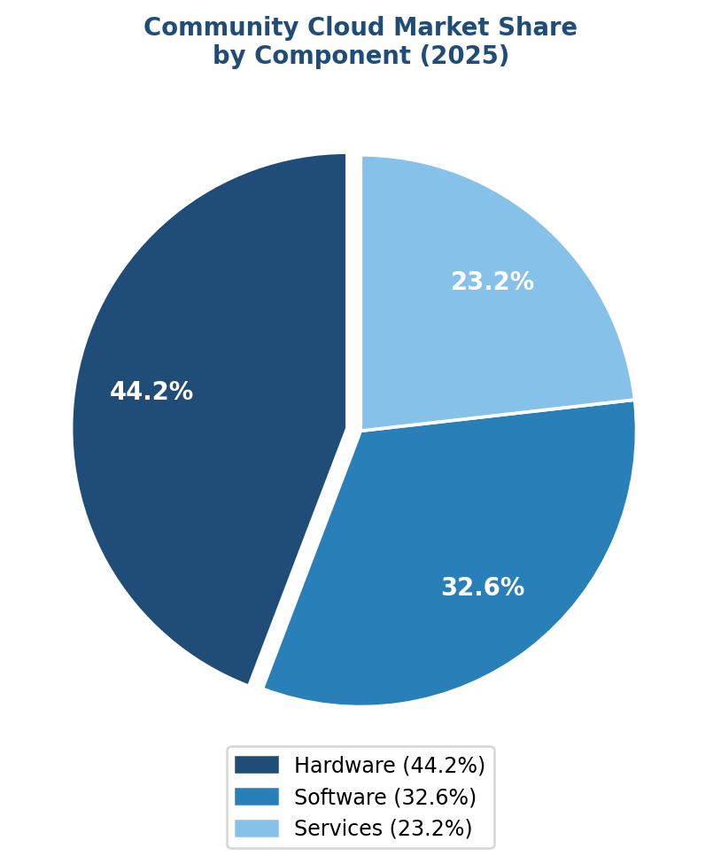 Hardware leads the component segment at 44.2% in 2025, forming the physical foundation of community cloud deployments, particularly in private and hybrid configurations. The hardware layer—encompassing servers, high-density storage systems, and networking equipment—supports mission-critical government, defense, and healthcare workloads requiring dedicated infrastructure for data sovereignty compliance and physical security mandates.
