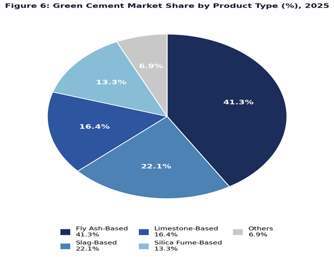 - Fly ash-based cement dominates with 41.3% share (2025), driven by abundant coal combustion by-product availability, proven pozzolanic performance, and alignment with regulatory mandates on industrial waste utilization.