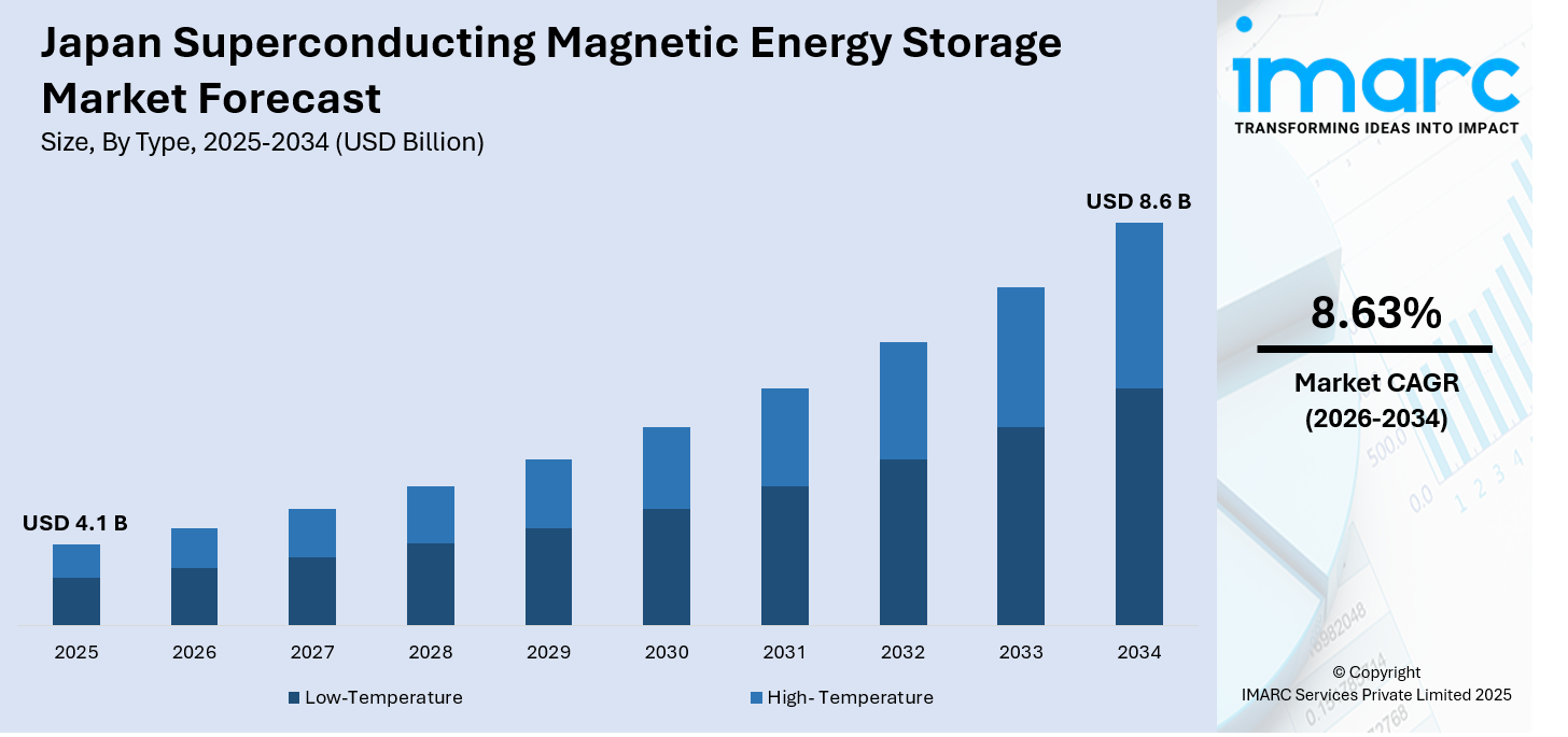 The Japan superconducting magnetic energy storage market size reached USD 4.1 Billion in 2025. Looking forward, IMARC Group expects the market to reach USD 8.6 Billion by 2034, exhibiting a growth rate (CAGR) of 8.63% during 2026-2034. Technological progress, domestic energy ambitions, and the push for carbon neutrality are driving the market. It is also supported by efforts to modernize the power grid, accessible urban land area constraints favoring high-density systems, and ultra-fast response energy storage requirements. Besides this, ongoing advancements in high-temperature superconducting (HTS) materials, falling costs of superconducting components, industrial demand for load balancing, supporting electric vehicle charging infrastructure, smart grid development schemes, and growing focus on domestic energy security and grid reliability are drivers pushing the Japan superconducting magnetic energy storage (SMES) market share.