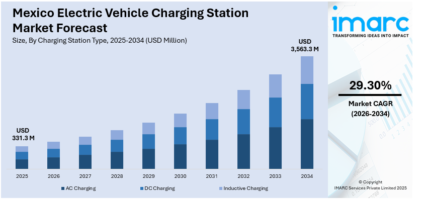 The Mexico electric vehicle charging station market size reached USD 331.3 Million in 2025. Looking forward, IMARC Group expects the market to reach USD 3,563.3 Million by 2034, exhibiting a growth rate (CAGR) of 29.3% during 2026-2034. The market is propelled by government incentives, expanding EV adoption, increasing fuel costs, urban air quality concerns, and private sector investments. Technological advancements in charging infrastructure, collaborations with automakers, and the country’s alignment with global decarbonization targets further support market expansion and long-term infrastructure development.