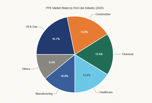 Oil and Gas commands 16.7% of global PPE demand in 2025. High-risk upstream and downstream operations mandate comprehensive head-to-toe protection programs certified to IOGP, OSHA, and EN standards for all personnel categories worldwide.