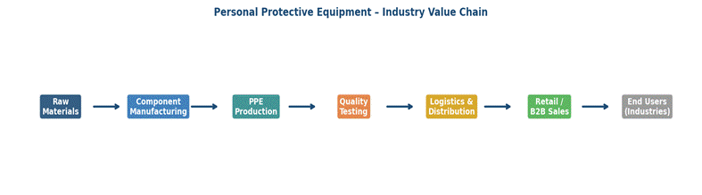 The PPE value chain begins with specialized raw materials including polycarbonates, high-performance polymers, aramid fibers (Kevlar/Nomex), nitrile compounds, and technical textiles. Material suppliers play a critical role, as input quality directly determines protective performance and certification compliance outcomes.