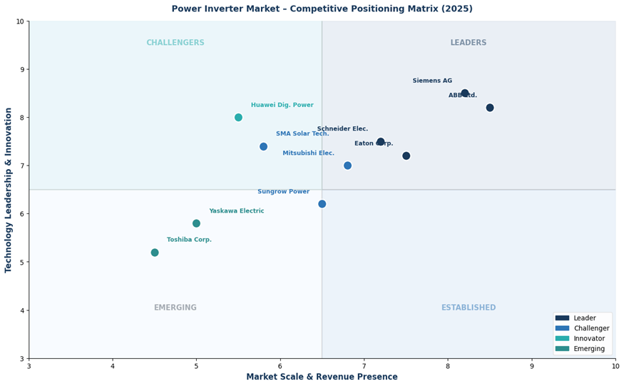 The global power inverter market is moderately consolidated, led by ABB, Siemens, Eaton, and Schneider Electric. In solar inverters, Chinese firms Sungrow and Huawei compete strongly with European players, with differentiation now driven by software features like predictive maintenance, remote monitoring, grid services, and energy management integration.