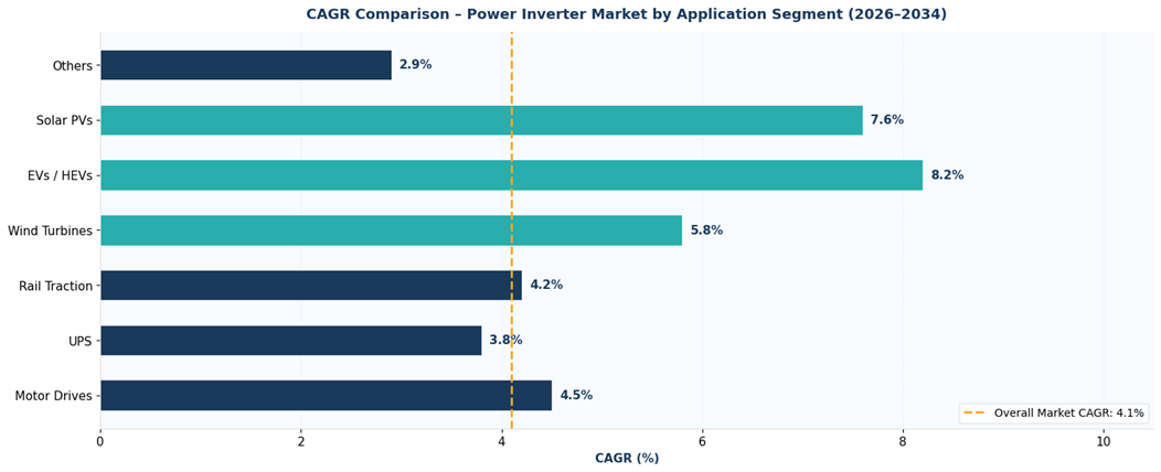 Application-level CAGR comparisons highlighting EVs/HEVs and Solar PVs as the two fastest-growing sub-categories within the global power inverter industry analysis through 2034, with both segments growing well above the 4.1% overall market CAGR.