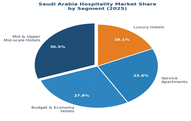 Mid and upper mid-scale hotels represent the dominant segment with a 30.5% share of the Saudi Arabia hospitality market in 2025, underpinned by strong demand from mid-tier domestic travelers, regional business visitors, and pilgrims seeking comfortable yet cost-conscious accommodations.