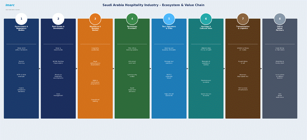 Saudi Arabia hospitality value chain is a complex, multi-tier ecosystem spanning upstream real estate and construction, through operational hospitality services, to downstream digital distribution and end traveler experiences. Each stage is populated by specialized operators whose performance directly influences product quality, cost competitiveness, and market responsiveness.