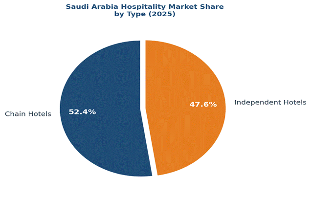 Among key growth drivers, the scaling of giga-projects including NEOM, the Red Sea Development, and Diriyah continues to unlock new luxury hospitality corridors. Chain hotels command 52.4% of the market, benefiting from global brand recognition, loyalty ecosystems, and Saudization-compliant workforce frameworks.