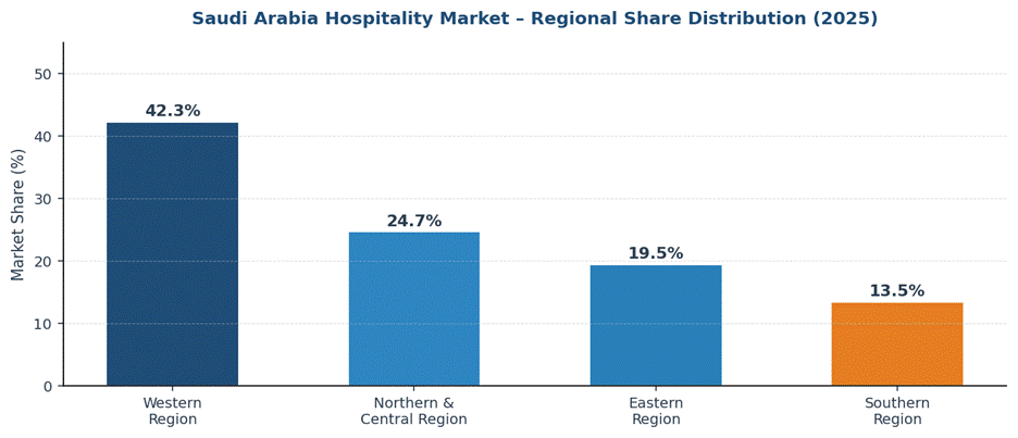 The Western Region currently dominates the Saudi Arabia hospitality market, accounting for a share of 42.3% in 2025, driven by Makkah and Madinah religious tourism and Jeddah's leisure and business travel market.